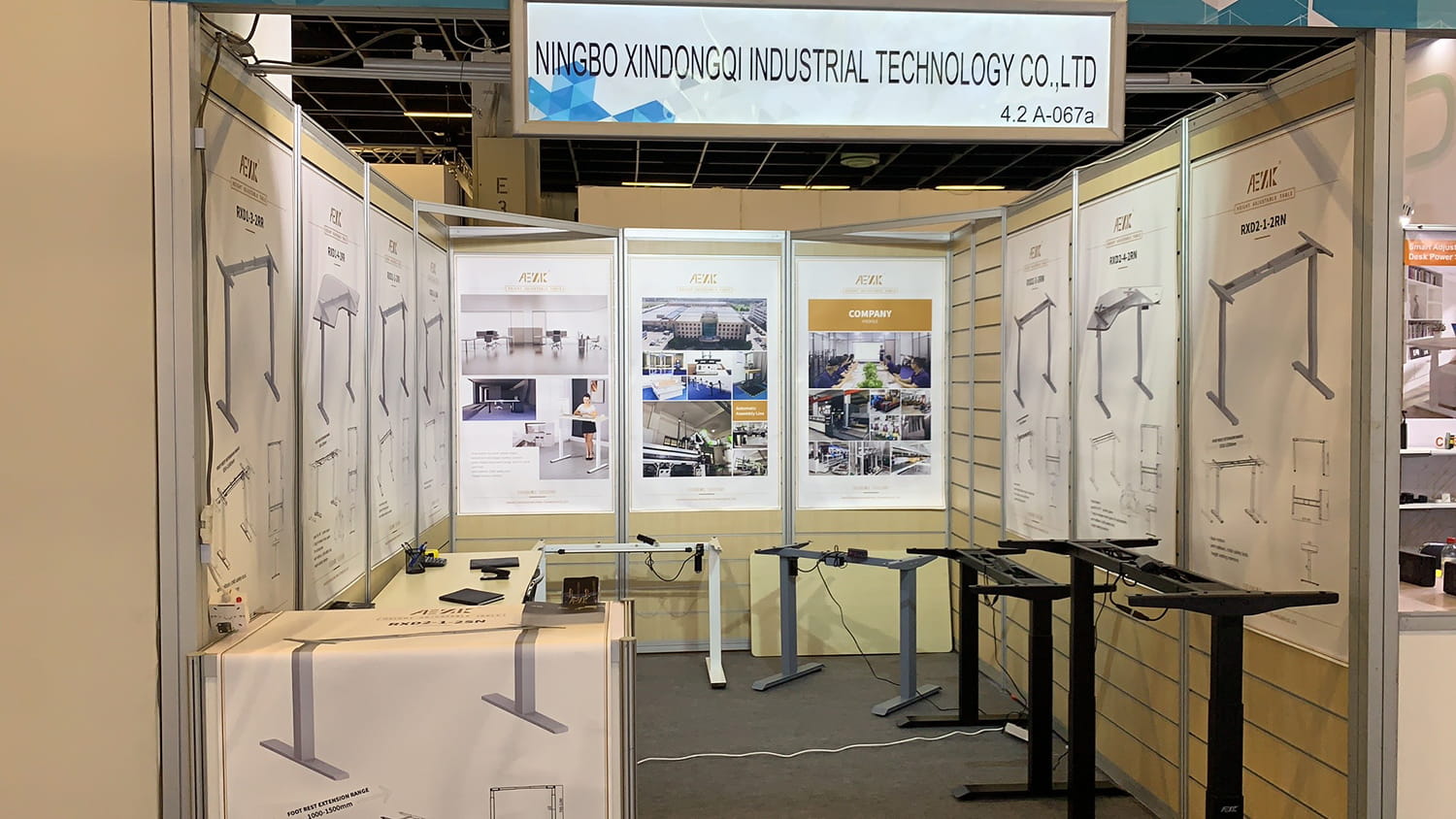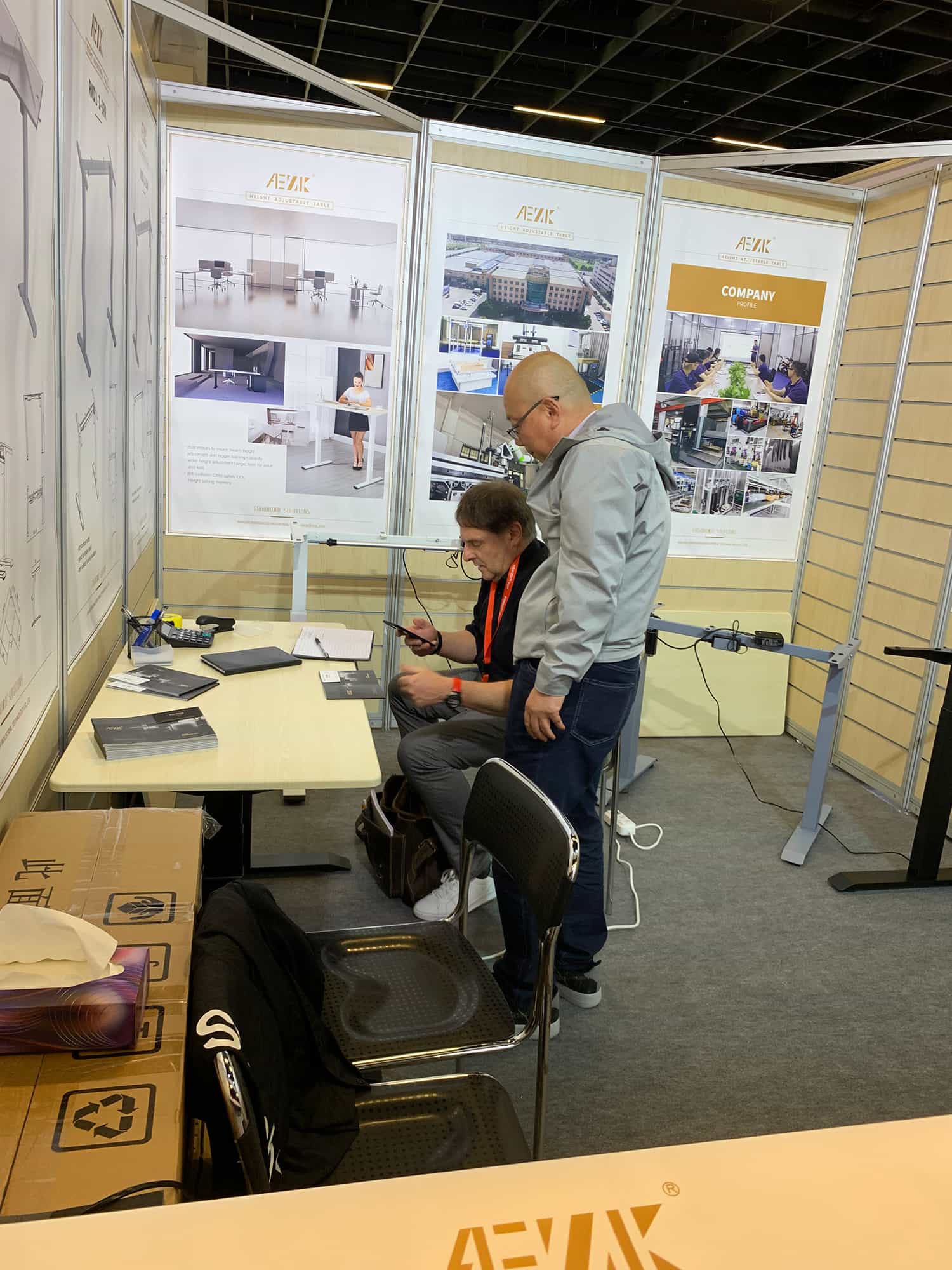 Titre : Exposition à Cologne/Allemagne, présentant les derniers bureaux debout à moteur unique et double moteur. Les personnalisations sont les bienvenues.